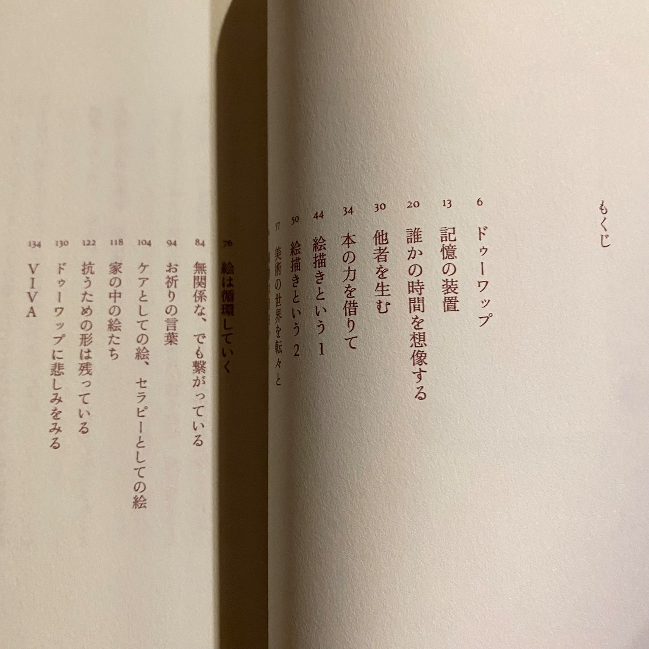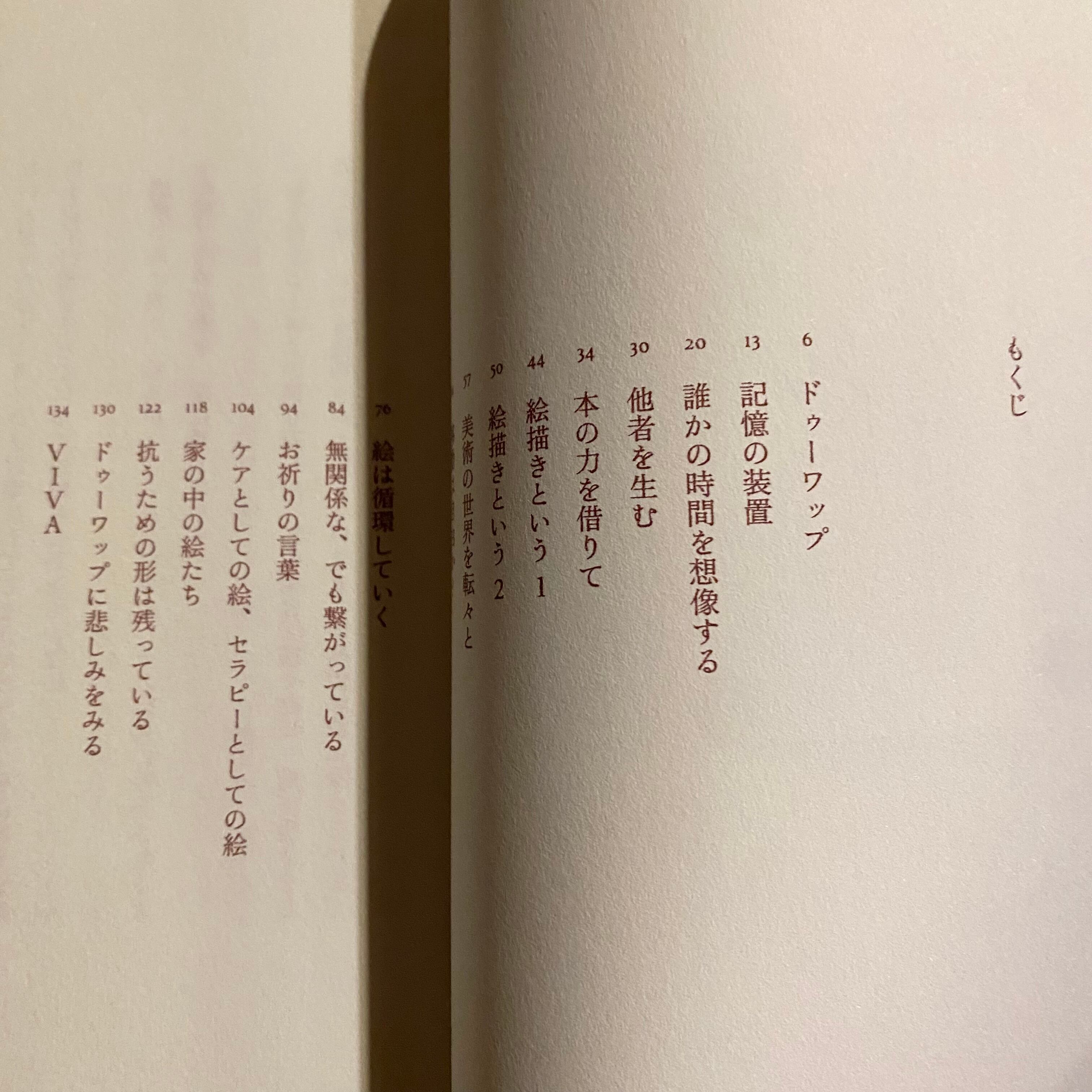 淡い混色の画面の中で具象と抽象の間を行き来する絵画作品と、「絵描き」となった経緯や制作、社会における絵画について綴られた17編のエッセイを収録。