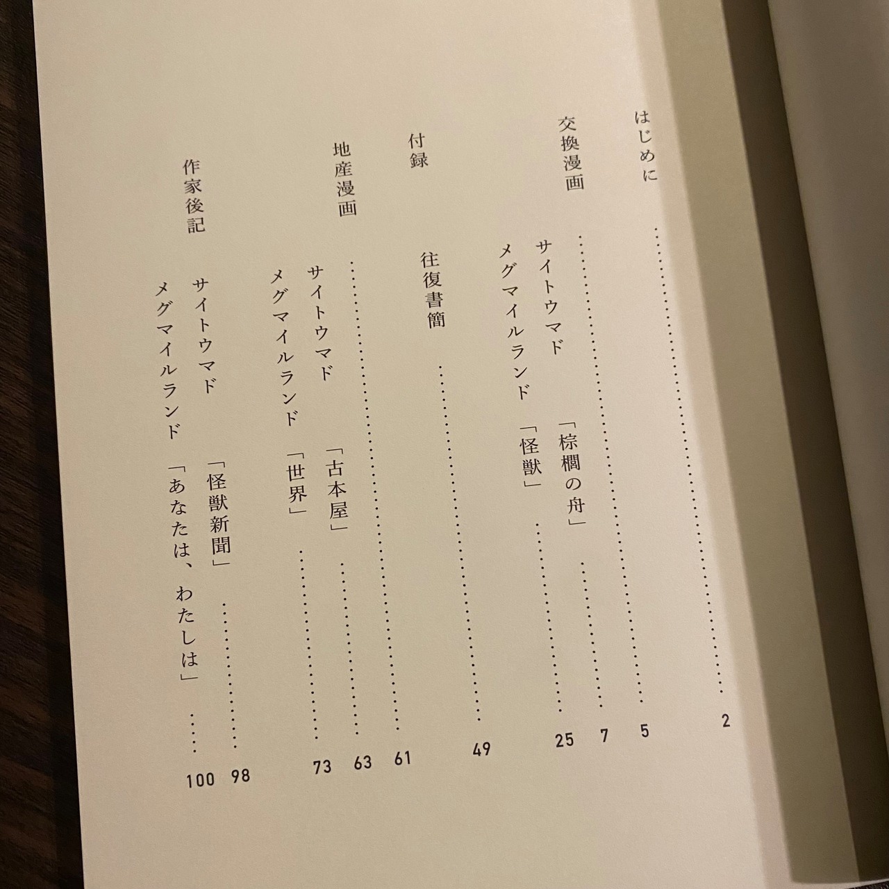 お互いの漫画のモチーフを題材とした『交換漫画』と、何やら見覚えのある古本屋が登場する『地産漫画』、2人の往復書簡を収録。